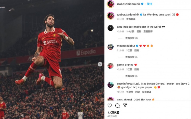 戰(zhàn)神級(jí)表現(xiàn)!索博斯洛伊社媒曬照慶祝大勝:接下來是溫布利時(shí)間! 2月7日訊 利物浦在本輪聯(lián)賽杯主場(chǎng)4-0大勝熱刺,索博斯洛伊表現(xiàn)搶眼。他不但打進(jìn)一球,還在本場(chǎng)比賽貢獻(xiàn)5射門+5次創(chuàng)造機(jī)會(huì)+9次對(duì)方禁區(qū)內(nèi)觸球+9次奪回球權(quán)。索博斯洛伊也在賽后通過社媒曬出自己的慶祝照 2025/02/07