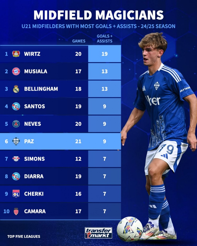 五大聯(lián)賽U21中場(chǎng)參與進(jìn)球:維爾茨19球最多,帕斯9球并列第四 2月7日訊 德國(guó)轉(zhuǎn)會(huì)市場(chǎng)統(tǒng)計(jì)了本賽季五大聯(lián)賽U21中場(chǎng)參與進(jìn)球的數(shù)量,并列出榜單,維爾茨參與19球居首,尼科-帕斯參與9球排名并列第4位。本賽季五大聯(lián)賽U21中場(chǎng)參與進(jìn)球榜:維爾茨(勒沃庫(kù)森)——19 2025/02/07