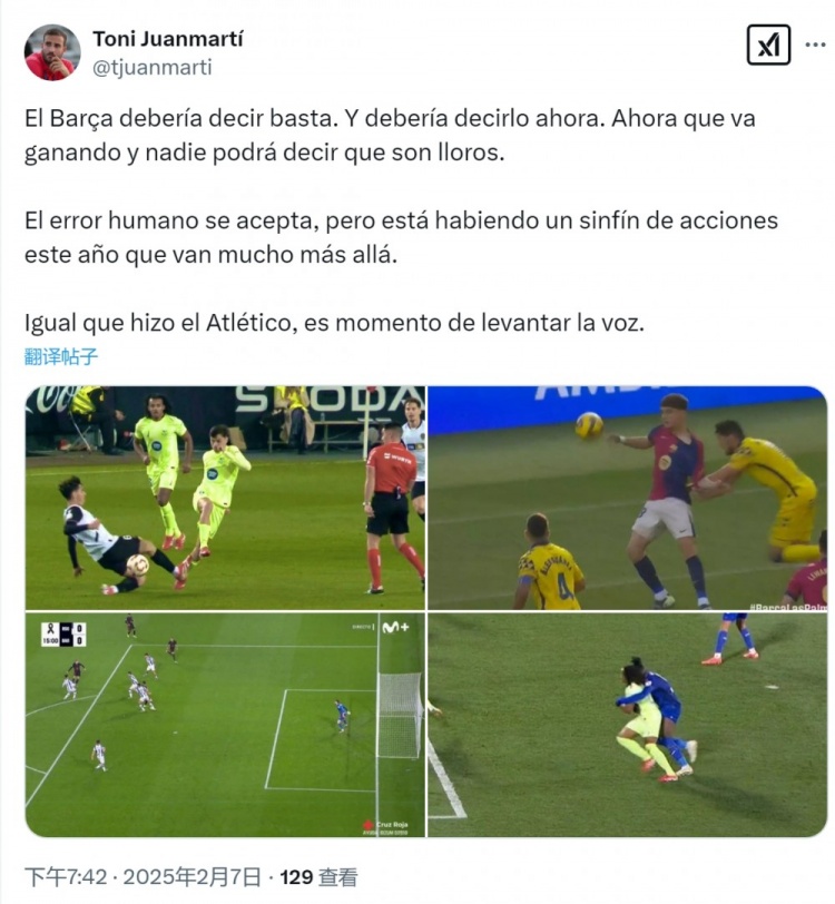跟隊(duì)記者曬巴薩遭誤判截圖:巴薩應(yīng)該發(fā)聲,現(xiàn)在就要說“夠了” 2月7日訊 巴薩跟隊(duì)記者Toni Juanmartí更新社媒動(dòng)態(tài),曬出巴薩本賽季遭到誤判的視頻截圖,并表示巴薩應(yīng)該發(fā)聲。“巴薩應(yīng)該說‘夠了’,他們現(xiàn)在就應(yīng)該說出來,現(xiàn)在他們正在贏球,沒有人會(huì)因此說他們 2025/02/07