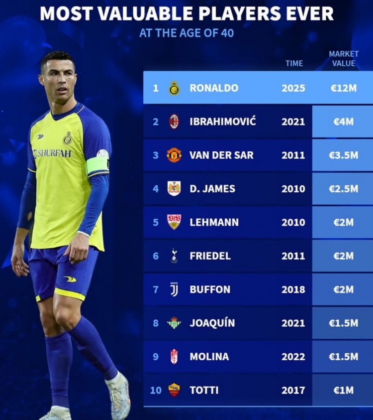 40歲身價(jià)最貴榜:C羅1200萬(wàn)歐第1,伊布、范德薩、布馮、托蒂在列 2月5日訊 C羅在今日迎來(lái)40歲生日,《轉(zhuǎn)會(huì)市場(chǎng)》也列出了40歲球員歷史身價(jià)最貴榜單,C羅無(wú)懸念居首。德轉(zhuǎn)列40歲歷史身價(jià)最貴榜:歐元1.C羅(利雅得勝利),2025,1200萬(wàn)2.伊布(米蘭),20 2025/02/05