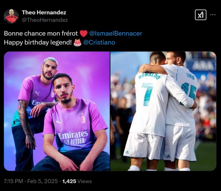 特奧告別本納塞爾,并祝福前皇馬隊(duì)友C羅:40歲生日快樂(lè),傳奇 2月5日訊 今天是C羅40歲的生日,特奧也向他送上了生日祝福,同時(shí)還告別了離開(kāi)米蘭加盟馬賽的本納塞爾。特奧曬出與兩人的合照,并寫道:@本納塞爾,祝你好運(yùn),我的兄弟。@C羅,生日快樂(lè),傳奇!特奧曾在20 2025/02/05