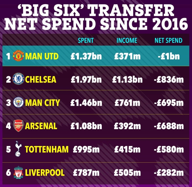BIG6近9年支出:曼聯(lián)凈支出10億鎊!切爾西支出近20億 利物浦墊底 2016年以來(lái)英超BIG6支出、收入、凈支出排行(單位:英鎊):1、曼聯(lián):支出13.7億;收入3.71億;凈支出10億2、切爾西:支出19.7億;收入11.3億;凈支出8.36億3、曼城:支出14.6 2025/02/05