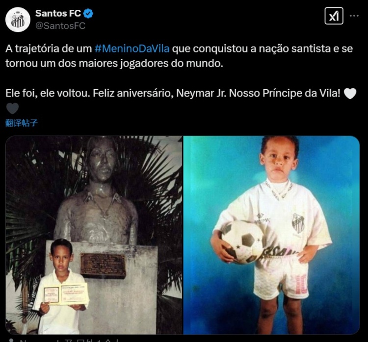 桑托斯官方社媒曬內(nèi)馬爾兒時(shí)照片:生日快樂(lè),我們的王子已經(jīng)歸來(lái) 2月5日訊 內(nèi)馬爾在今日迎來(lái)33歲生日,母隊(duì)桑托斯也送上祝福。桑托斯曬出了內(nèi)馬爾兒時(shí)身穿桑托斯球衣的照片,并配文:“我們的鄉(xiāng)村男孩的過(guò)往軌跡,他征服了桑托斯并成為了世界最佳之一。他離開(kāi)過(guò),他又回來(lái)了。 2025/02/05