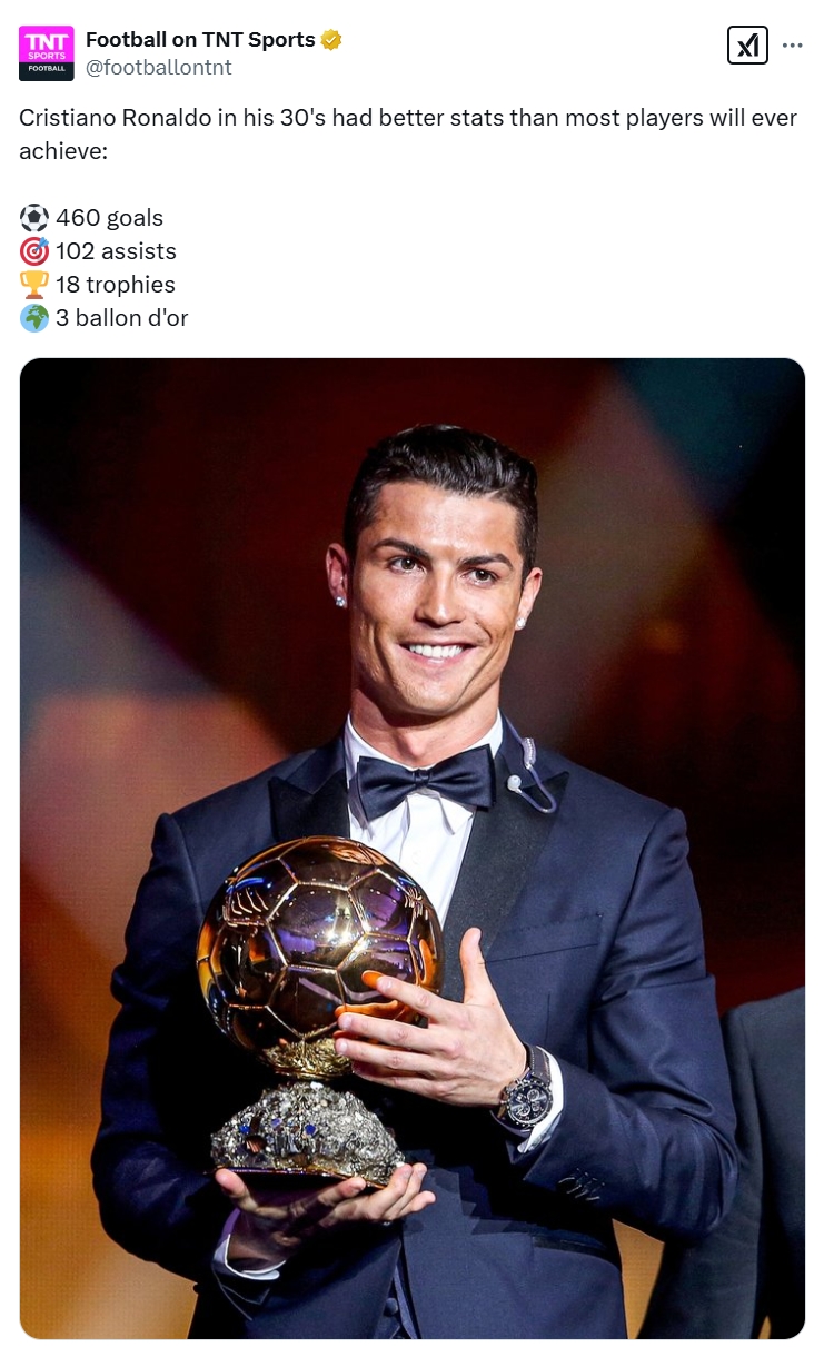 10年460球102助18冠3金球!C羅30歲后數(shù)據(jù)已令許多人一生難以企及 外媒TNT:C羅30歲后達(dá)成的這些數(shù)據(jù),可以超越大多數(shù)球員整個(gè)生涯↓??460顆進(jìn)球????102次助攻????18座獎(jiǎng)杯????3座金球獎(jiǎng) 2025/02/05