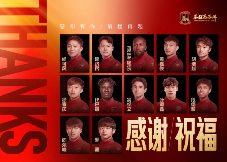 2025賽季·公告|感謝相伴,祝福未來(lái)! 經(jīng)協(xié)商一致,球員尚可風(fēng)、延濟(jì)民、萊昂納多-席爾瓦、黃嘉俊、胡浩越、徐春慶、伊巴謙、賓紀(jì)文、葉道鑫、段德智、向榮峻、郭通與蘇州東吳足球俱樂(lè)部合同到期或租借期滿,正式離隊(duì)。效力蘇州東吳期間,各位球員訓(xùn)練刻 2025/02/05