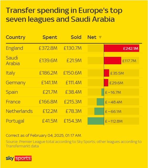 各大聯(lián)賽冬窗支出:英超狂撒近4億鎊凈支出2.4億,西甲僅2千萬(wàn) 02月04日訊 冬窗正式關(guān)閉,天空體育統(tǒng)計(jì)了各大聯(lián)賽冬季轉(zhuǎn)會(huì)窗的開(kāi)支,并作以下排名。歐洲7大聯(lián)賽+沙特聯(lián)冬窗轉(zhuǎn)會(huì)支出排名(單位:英鎊):1、英格蘭:支出3.728億;賣(mài)出1.307億;凈支出2.421 2025/02/04