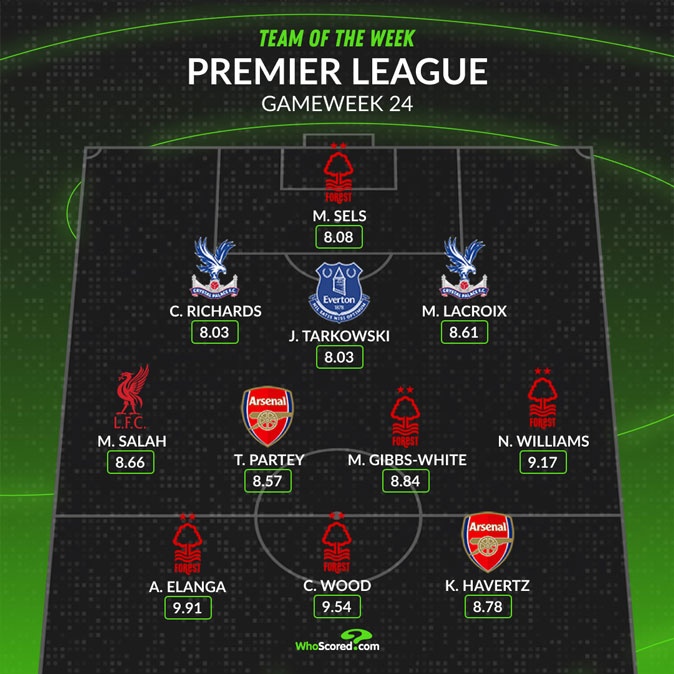 WhoScored英超第24輪最佳陣:薩拉赫、哈弗茨在列,諾丁漢森林5人 2月4日訊 英超第24輪比賽戰(zhàn)罷,WhoScored根據(jù)球員評(píng)分排出了本輪最佳陣容,薩拉赫、哈弗茨、托馬斯在列,諾丁漢森林5名球員入選。WhoScored英超第24輪最佳陣容:門(mén)將:塞爾斯(諾丁漢森林 2025/02/04