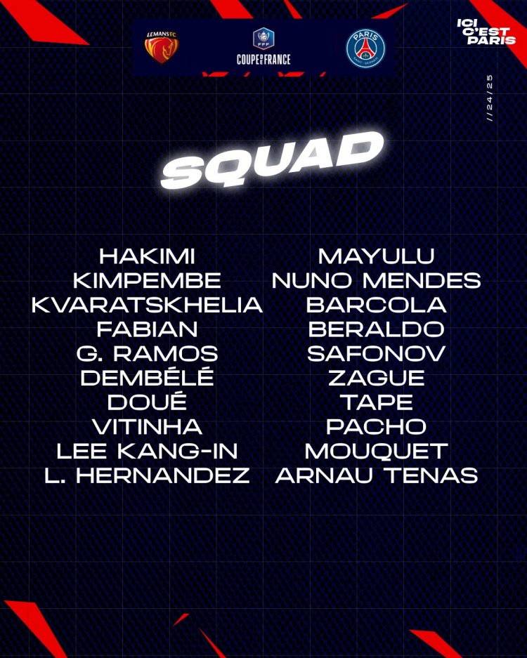 巴黎法國(guó)杯名單:登貝萊、K77在列,馬爾基尼奧斯、內(nèi)維斯缺席 2月4日訊 北京時(shí)間明天凌晨,巴黎將在法國(guó)杯1/8決賽中對(duì)陣?yán)彰?,巴黎公布了此役的球員名單,登貝萊、克瓦拉茨赫利亞在列,馬爾基尼奧斯、若昂-內(nèi)維斯、扎伊爾-埃梅里缺席。巴黎對(duì)勒芒大名單門(mén)將:薩福諾夫、 2025/02/04