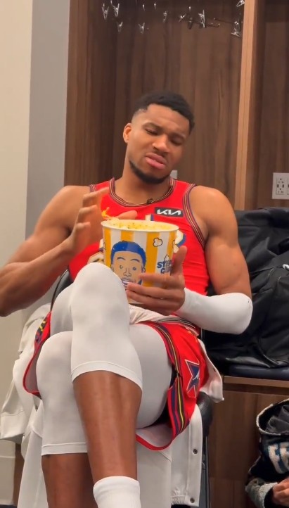 賽前,字母哥在更衣室大吃“庫里爆米花”,同時,字母哥問道:“吃這個能讓你的投籃更準嗎?”