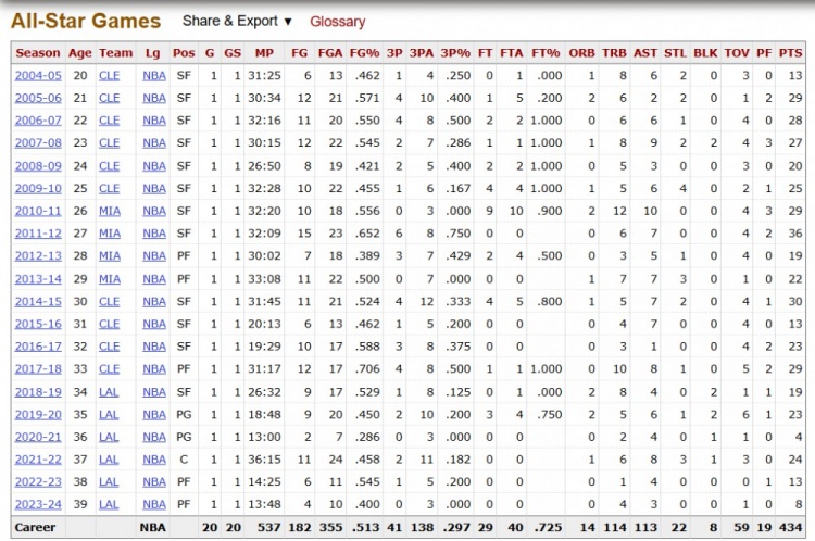 詹姆斯生涯首次入選全明星后缺席 此前出戰(zhàn)20次得434分歷史最多
