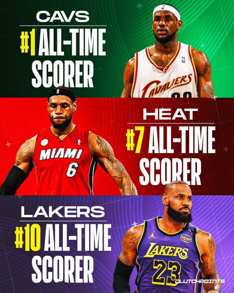 詹姆斯在騎士、熱火、湖人三支球隊(duì)總得分皆隊(duì)史前十 歷史唯一