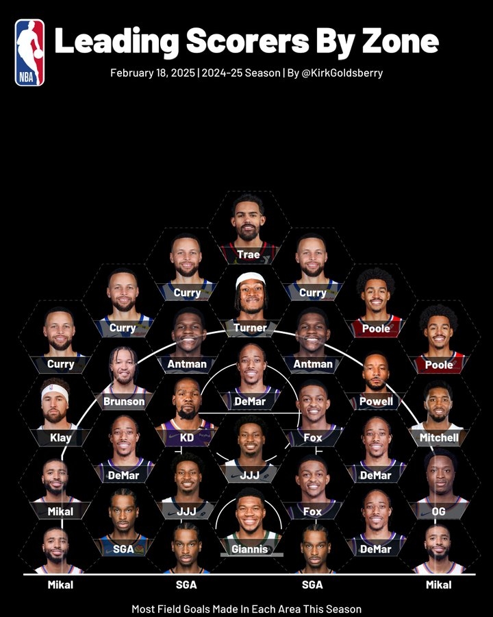 各區(qū)域得分王:庫里右側(cè)45度最多 大橋底角之王 字母SGA制霸籃下