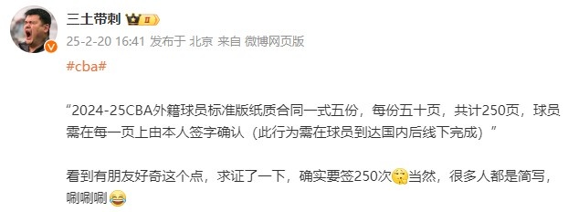 其中,聲明中的第五點寫道:“五、關于大家所關心的外籍球員聘用合同的簽訂科普一二:2024-25CBA外籍球員標準版紙質合同一式五份,每份五十頁,共計250頁,球員需在每一頁上由本人簽字確認(此行為需在球員到達國內后線下完成),同時每份合同需加蓋俱樂部騎縫章,至此合同簽訂流程結束。五份合同需由俱樂部或俱樂部指定專人寄(送)至CBA公司相關部門審核,審核通過后方認定此合同為有效合同?!?/p>