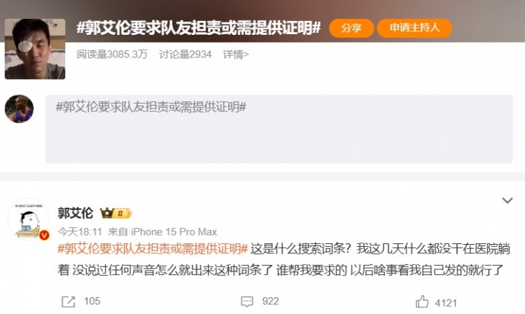 在今日微博熱搜中,出現(xiàn)詞條“郭艾倫要求隊(duì)友擔(dān)責(zé)或需提供證明”。