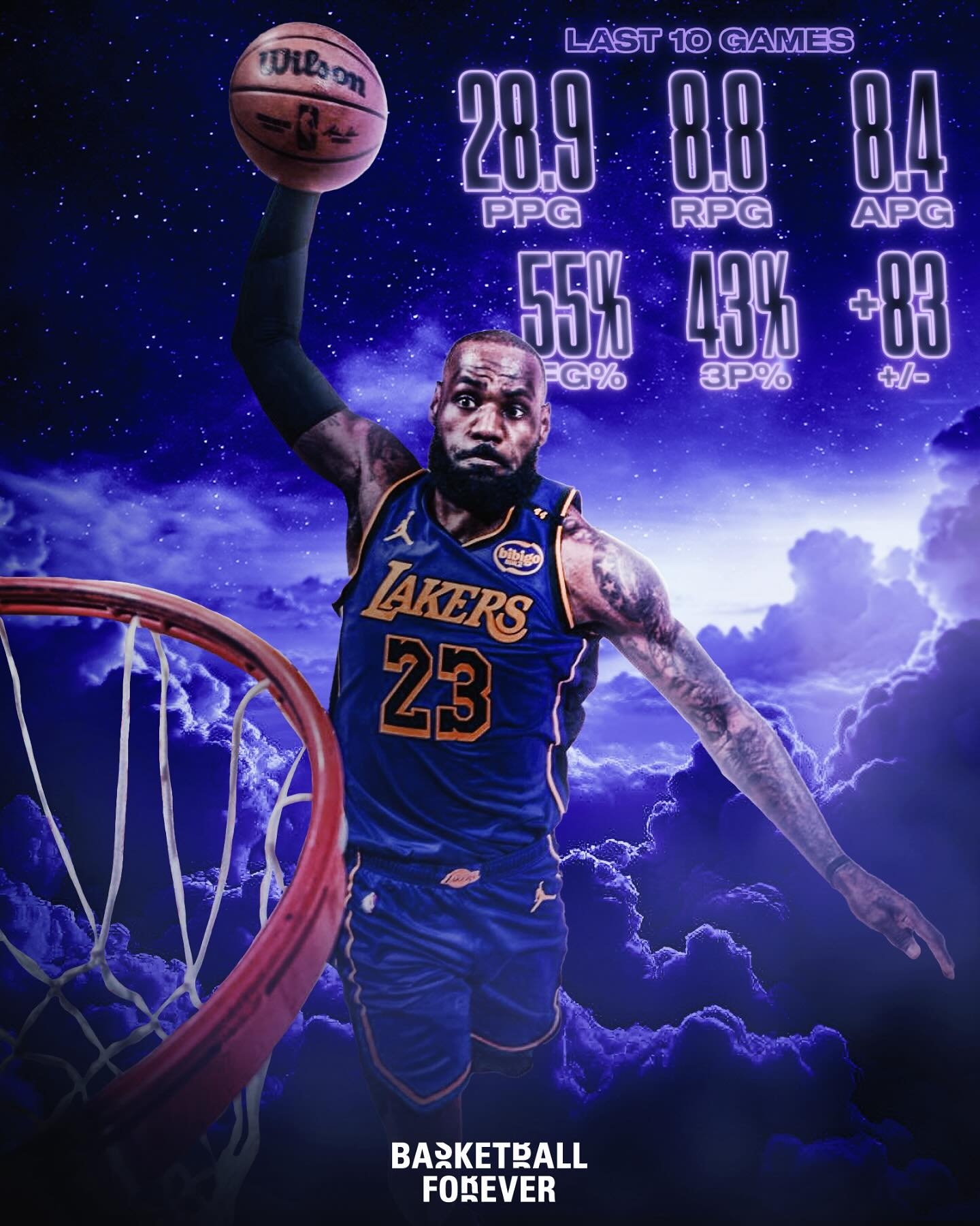 詹姆斯過去10場(chǎng)場(chǎng)均28.9分8.8板8.4助 命中率55%三分43%正負(fù)值+83