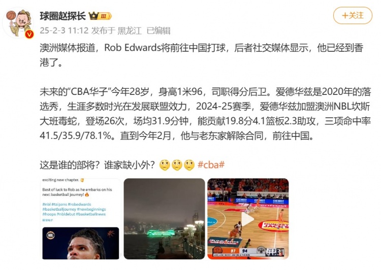 2月3日訊 今日,據(jù)媒體人球圈趙探長透露,澳洲媒體報(bào)道,羅伯-愛德華茲(Rob Edwards)將來中國打球,后者社交媒體顯示,他已經(jīng)到香港了。