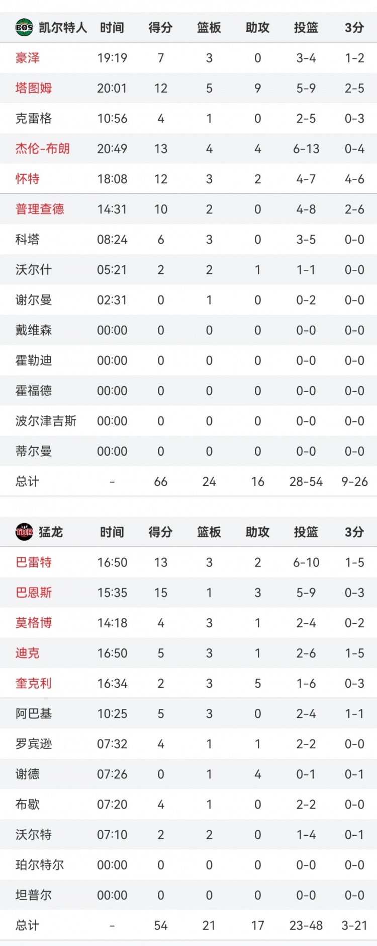 凱爾特人半場(chǎng)66-54領(lǐng)先猛龍12分 全隊(duì)4人得分上雙
