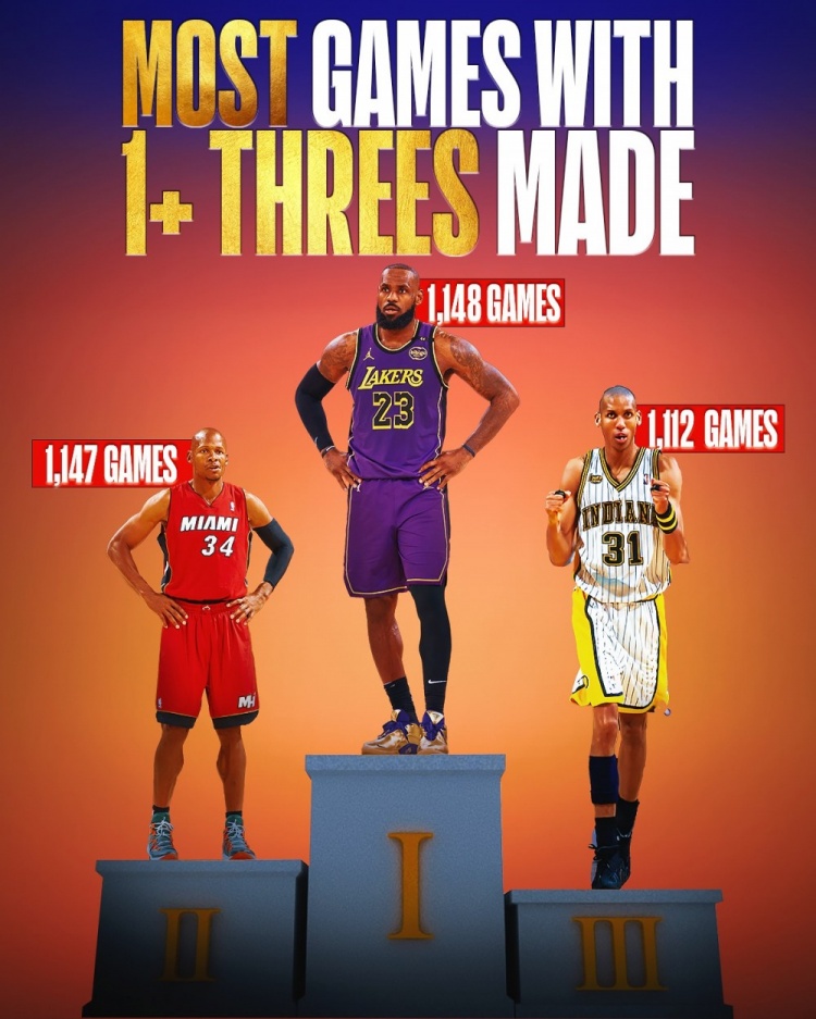 據(jù)統(tǒng)計,本場比賽過后,詹姆斯生涯至今已經(jīng)有1148場比賽至少命中1記三分,超越雷-阿倫(1147)獨霸歷史第一,雷吉-米勒(1112場)排名歷史第三。