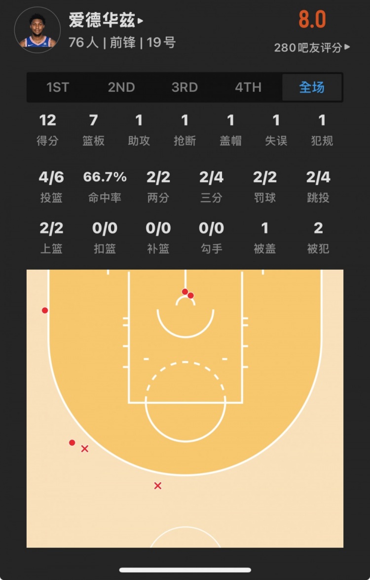 76人41號秀 阿德姆-博納 登場12.5分鐘