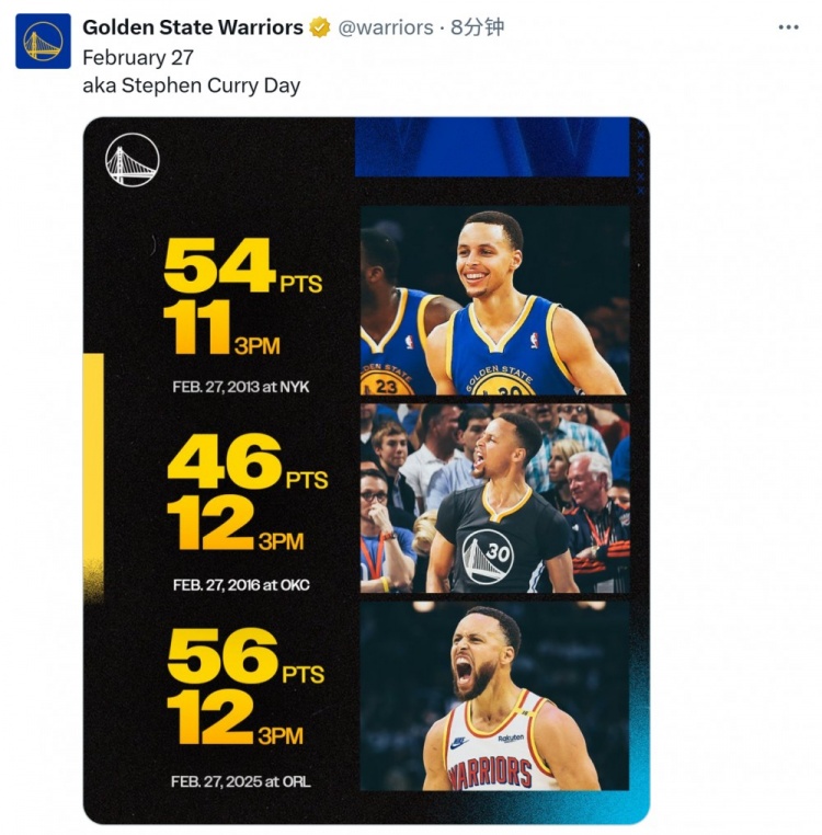 勇士官方曬圖寫道:“2月27日(美國時(shí)間),也稱為‘庫里日’?!?/p>