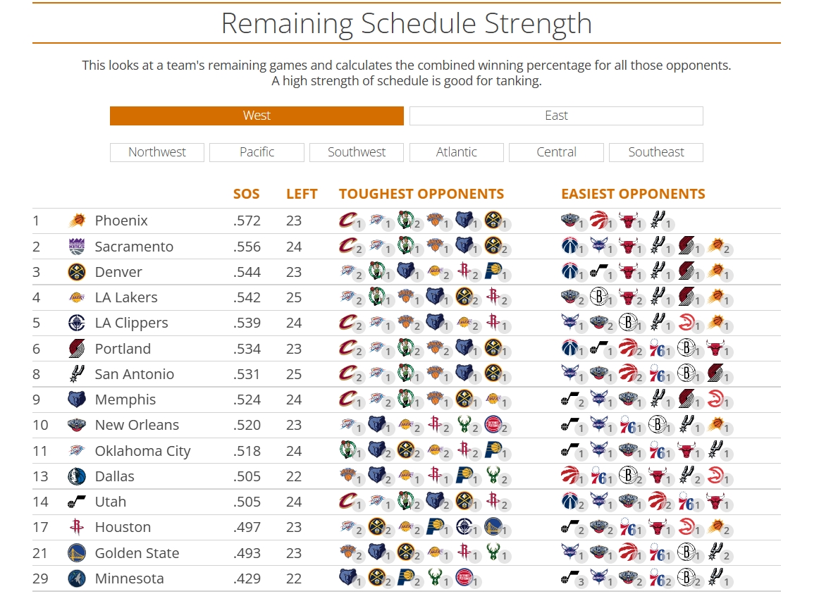 西部剩余賽程難度(最前面數(shù)字是賽程難度在聯(lián)盟所有球隊(duì)中的排名)