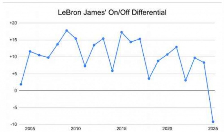 但詹姆斯尚未顯示出任何明顯的下滑跡象。即使是職業(yè)生涯首次出現(xiàn)負的場上場下球隊凈效率差值,實際上也是歷史級別糟糕運氣的體現(xiàn),而不是詹姆斯自身的問題。