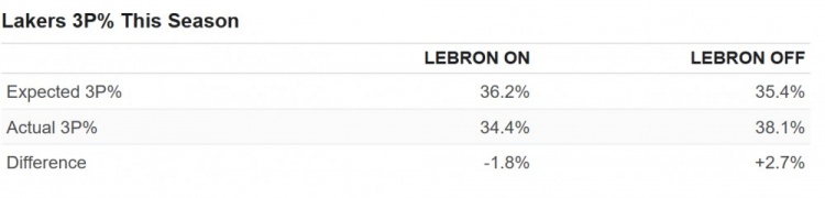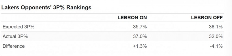此外,當詹姆斯在場時,湖人對手的預期三分命中率更低。