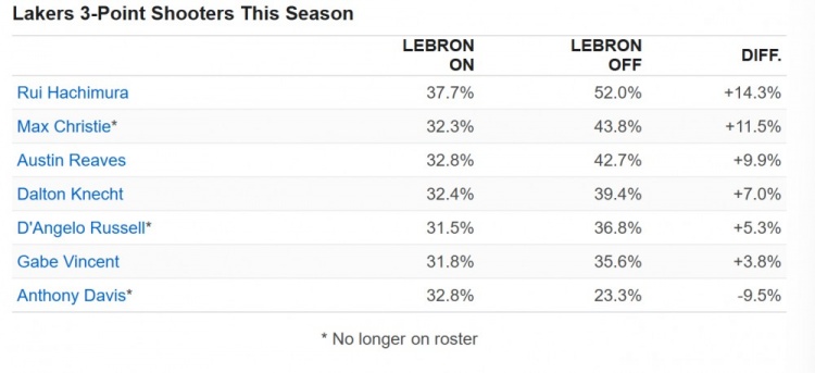 (圖為詹姆斯在場和不在場時,湖人其他隊友的三分命中率)