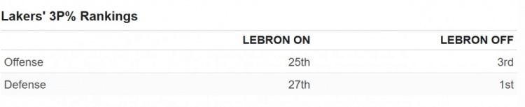 (圖為詹姆斯在場和不在場時,湖人的三分命中率和對手三分命中率的排名)