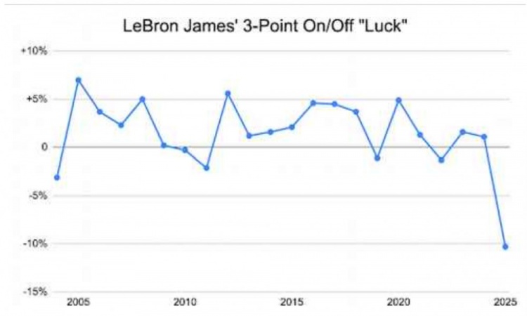 公平地說,這并不完全是運氣的衡量標準,因為它涉及一些技術因素。例如,頂級進攻球員就應該擁有正的場上場下三分“運氣值”,因為他們能夠命中投籃并為隊友創(chuàng)造空位機會,但這只會讓詹姆斯目前的處境更加令人驚訝。