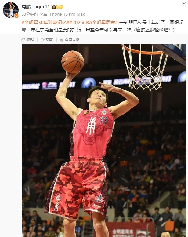 周鵬配文寫道:“一轉(zhuǎn)眼已經(jīng)是十年前了,回想起那一年在東莞全明星賽的扣籃,希望今年可以再來一次(應(yīng)該還很輕松吧?) ???”