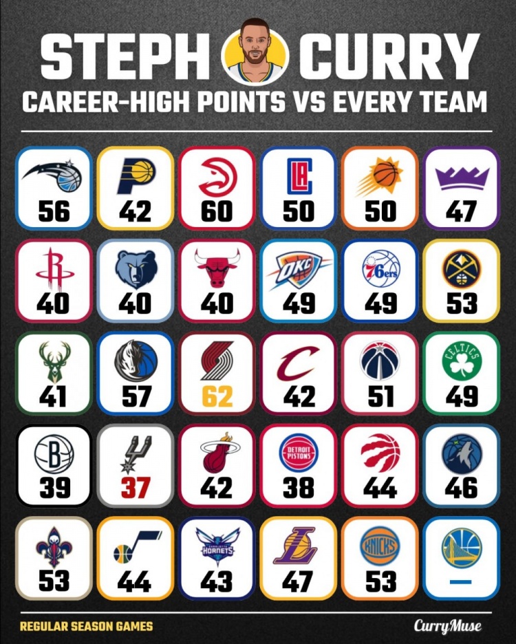庫里對陣29隊(duì)最高分:9隊(duì)被掄下50+ 開拓者成最大受害者