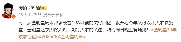 賽前,周琦發(fā)博展望比賽,并寫道:“每一屆全明星周末都承載著CBA聯(lián)賽的美好回憶,很開心今年又可以和大家歡聚一堂,全明星之夜即將點(diǎn)燃,期待大家的關(guān)注,咱們周日晚上賽場(chǎng)見?!?/p>