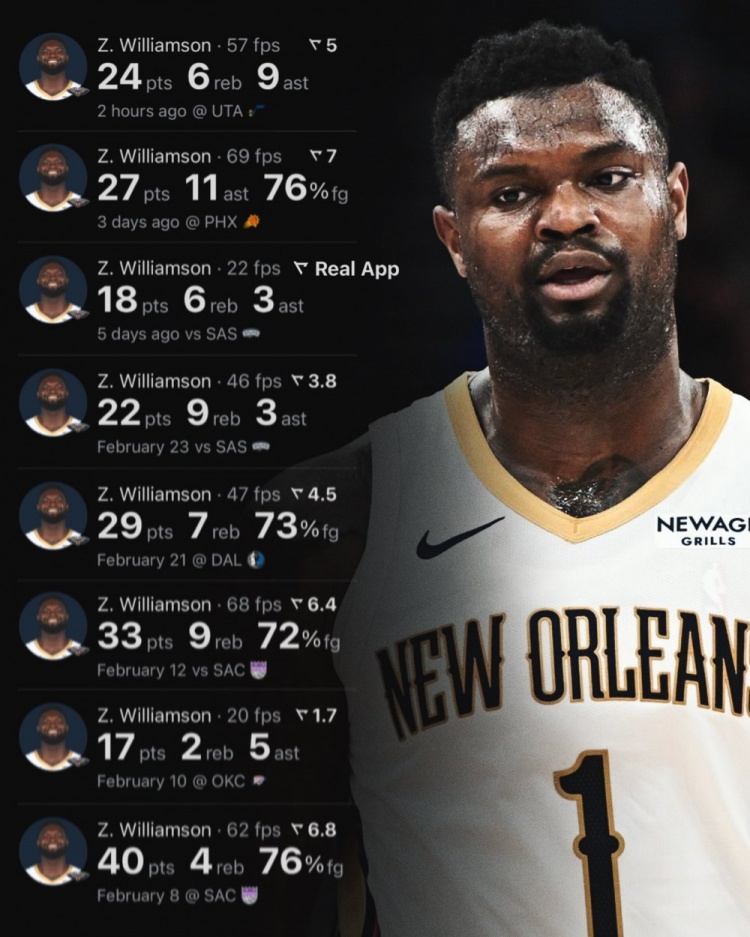 據統計,在近10場比賽中,錫安在場均28.3分鐘的上場時間里,可以砍下26.3分6.6籃板5.6助攻,投籃命中率高達65.2%,