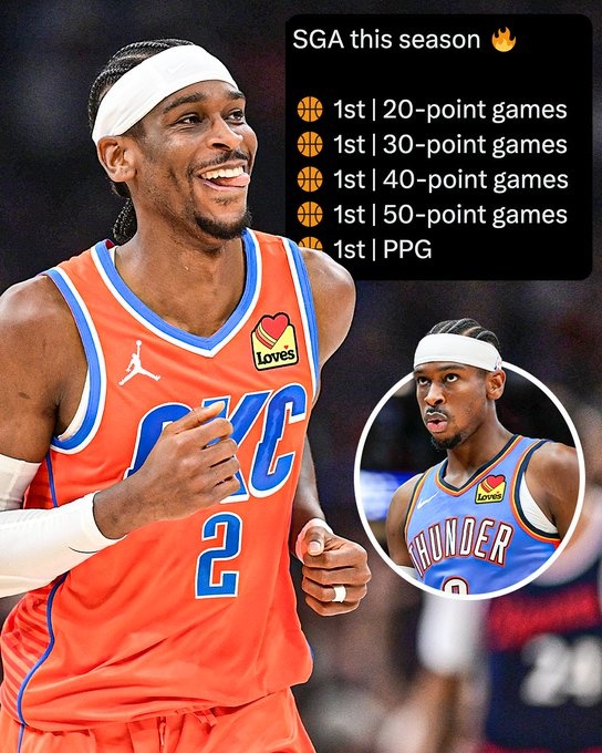 根據(jù)數(shù)據(jù)統(tǒng)計(jì),賽季至今,亞歷山大20+、30+、40+、50+場次以及場均得分(32.6分)都是聯(lián)盟第一。