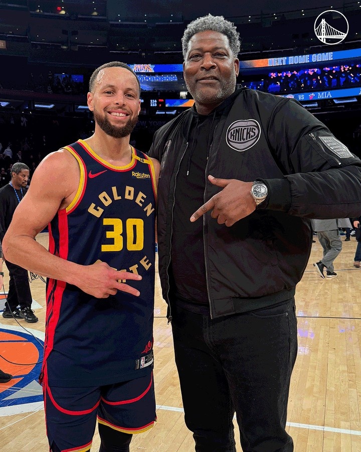 賽后,勇士官推曬出了一張庫里和名宿“大媽”拉里-約翰遜的合影,后者是庫里父親戴爾-庫里黃蜂時期的隊友。