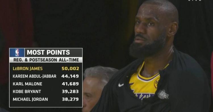 截至發(fā)稿前,湖人球星詹姆斯已拿到3分,總得分來到50002分,繼續(xù)高居聯(lián)盟歷史第一。