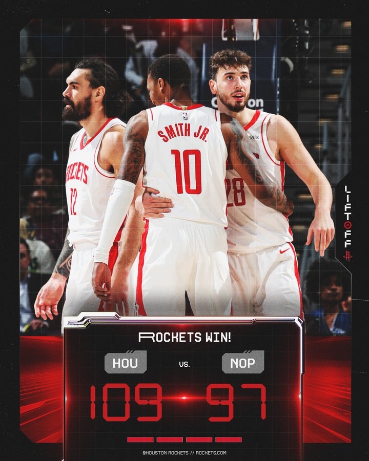 賽后,火箭官方曬出本場贏球海報(bào),申京、亞當(dāng)斯和小賈巴里登上封面。