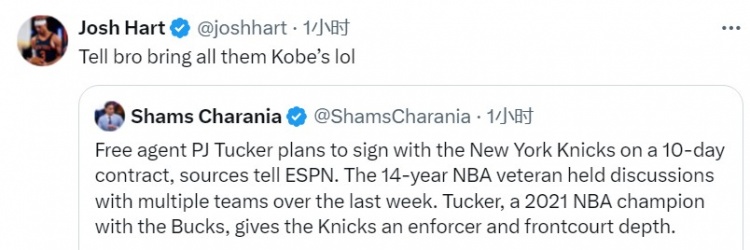 3月9日訊 據(jù)名記Shams報道,消息人士透露,PJ-塔克計劃與尼克斯簽下一份十天短合同。尼克斯球員哈特調侃道:“告訴兄弟,把他的所有科比鞋都帶來。”值得一提的是,塔克收藏了大量的稀有球鞋。 標簽: 籃球 NBA 尼克斯