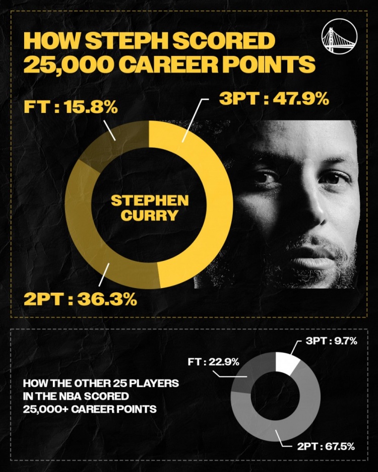 庫里25000分得分方式占比:兩分36.3%,三分47.9%,罰球15.8%;聯(lián)盟歷史上其他25位得分超25000的球員:兩分67.5%,三分9.7%,罰球22.9%。 標(biāo)簽: 籃球 NBA 勇士 庫里