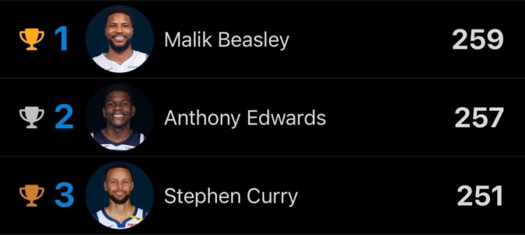 最終誰會(huì)第1?聯(lián)盟三分榜前3:比斯利259 華子257 庫(kù)里251