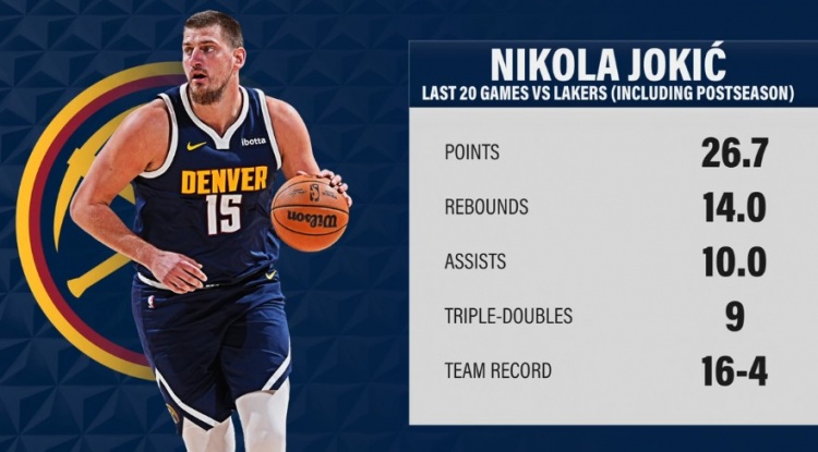 約基奇過去20場對陣湖人:場均26.7分14板10助&9次三雙 16勝4負