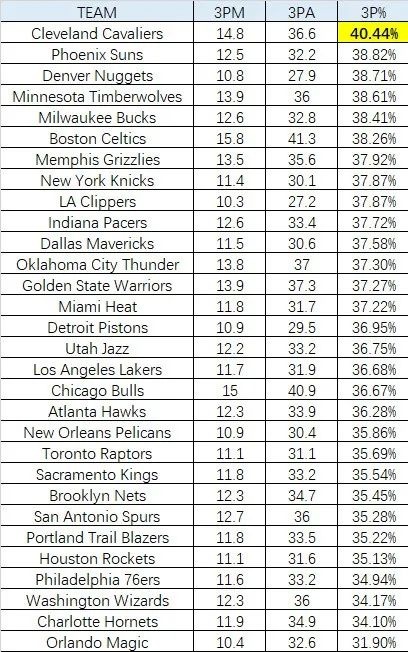 本賽季,防守人距離投籃球員4英尺或以上的空位三分出手中,騎士隊(duì)的命中率高達(dá)40.4%,全聯(lián)盟斷檔第一。