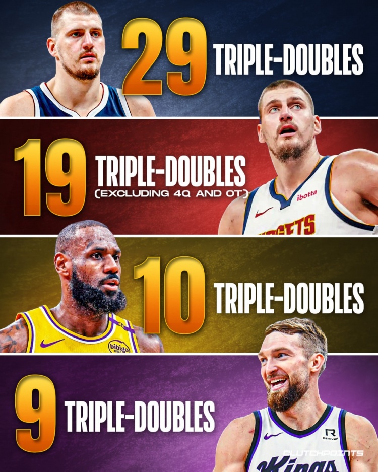 本賽季三雙榜:約基奇29次第一&只算前3節(jié)19次 詹姆斯10次第二