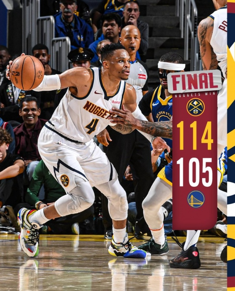 賽后,掘金官方曬出了贏球海報(bào),威少登上封面。