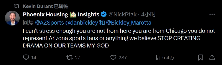 球迷一:我簡直不能更強(qiáng)調(diào)這一點(diǎn),你不是本地人,你是芝加哥人,不能代表亞利桑那州的體育迷,也不能代表我們的任何想法。停止在我們的球隊(duì)制造鬧劇吧,老天啊!