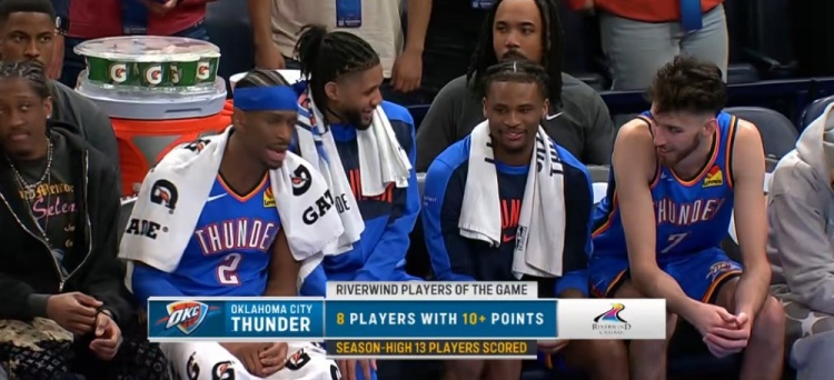 本場(chǎng)比賽雷霆全員發(fā)揮,全隊(duì)共有13個(gè)人有得分入賬,創(chuàng)本賽季新高,其中更是有8人得分上雙!