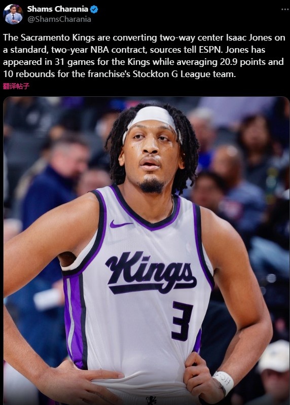 3月23日訊 今日,據(jù)ESPN著名記者Shams Charania報(bào)道,據(jù)消息人士向透露,國王將與雙向中鋒艾薩克-瓊斯簽訂一份為期兩年的標(biāo)準(zhǔn)NBA合同。