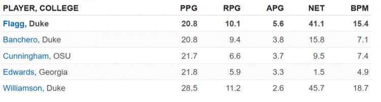 雖然即戰(zhàn)力和發(fā)展?jié)摿κ遣煌木S度,但弗拉格在大學(xué)賽場的統(tǒng)治表現(xiàn)同時通過了數(shù)據(jù)驗證與球探肉眼觀察的雙重檢驗,尤其是當(dāng)將他與NBA球星進(jìn)行類比時。