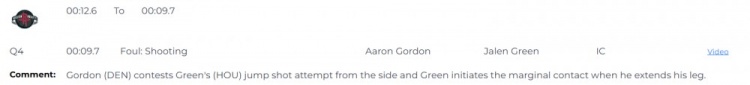 比賽最后9.7秒,戈登(掘金)從側(cè)面干擾杰倫-格林(火箭)的投籃出手,格林在伸腿時(shí)主動制造了輕微接觸。